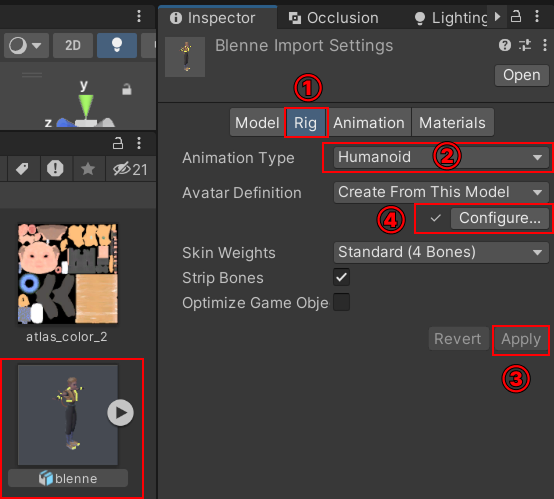 - アバターのFBXファイルを選択してInspectorを開いて、Rigを選択します。
