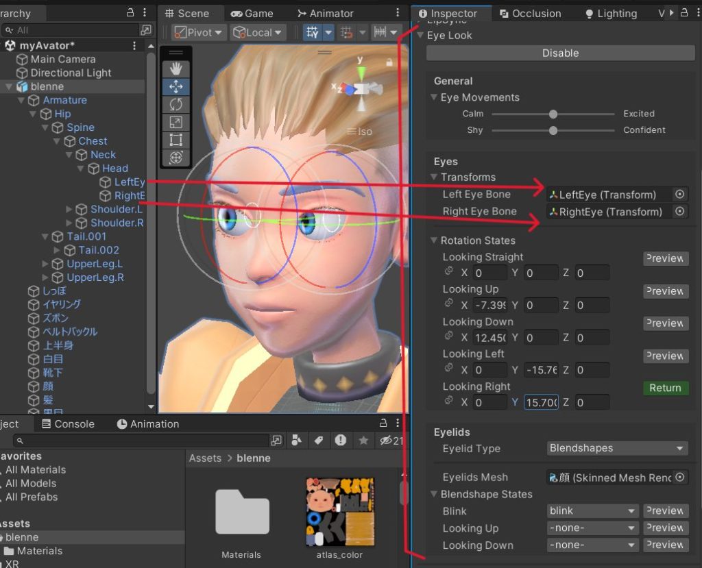 Left Eye Bone, Right Eye Boneにそれぞれのボーンをドラッグ&ドロップします。