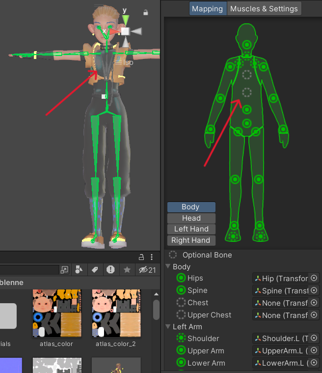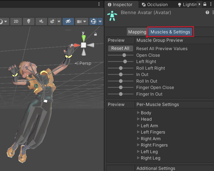 ちなみにボーンの設定横のMuscles & Settingsでは動きのチェックや調整ができます。