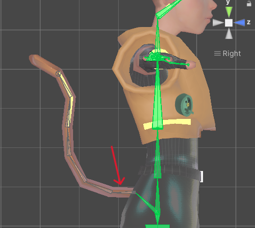 揺れをつけてくれる機能は、揺れるボーンの根本のボーンにつけます。根本のボーンにつければ、そこから出てる子ボーンも揺れてくれます。
