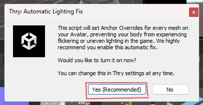 アップロード前にこういうウィンドウが開いたら、光や影の表示が変にならないように、自動で補正してくれる便利な機能だから入れろって言われてるのでYesで続けます。