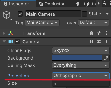 カメラが広角でキャラクターの顔が歪んでしまうという場合は、Main CameraのInspectorでProjectionをOrthographicにすると、歪まずに撮れるときもありましたが、毎回うまくいくわけではないみたいです…。
