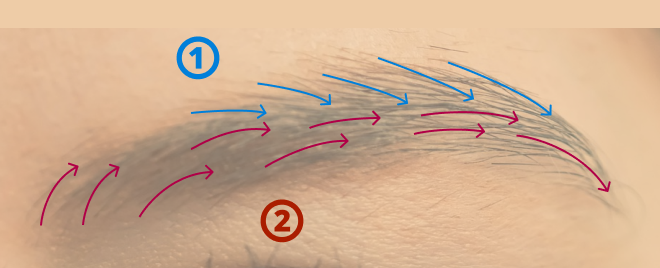 ①と②の流れがぶつかったとこで濃くなることで自然なニュアンスが出ます。また、②の下からの流れも眉頭では上方向に生えているのが、だんだん横方向に変化します。