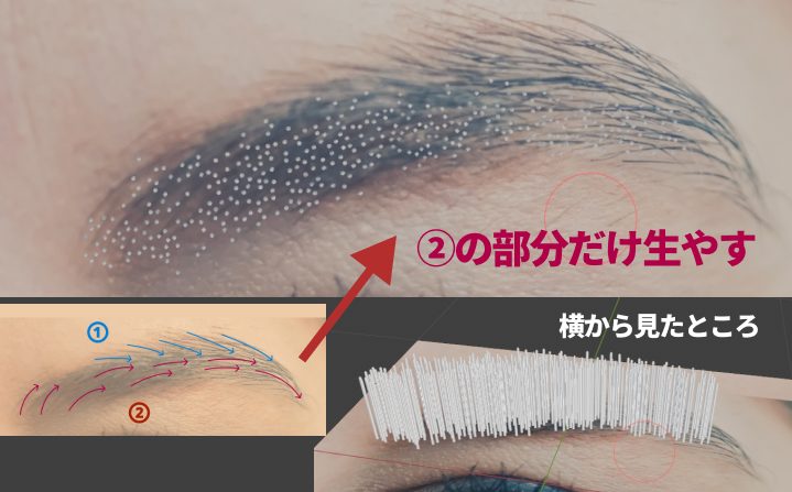眉頭から生やしていきますが、眉尻は、最後まで生やすと毛の長さ分はみ出してしまうので、毛の長さ分空けておきます。