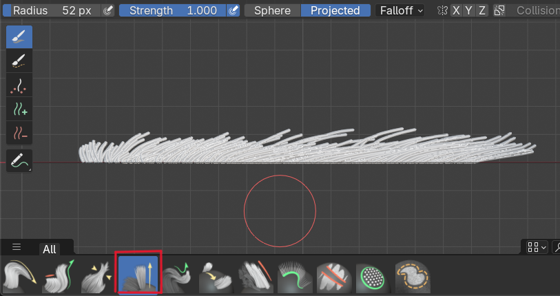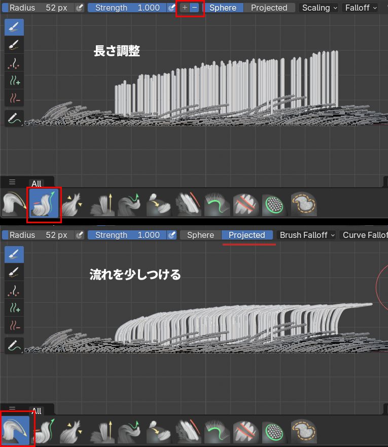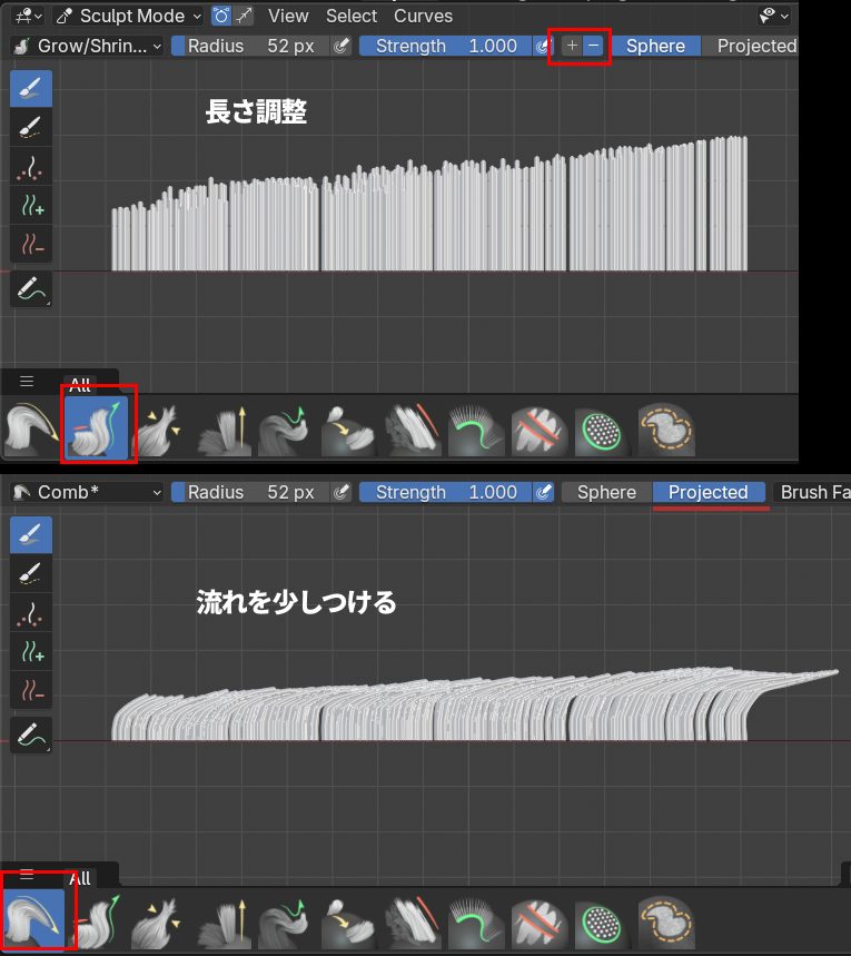 Densityブラシで、毛の流れで解説した、②の下からの流れの部分だけにカーブを生やしていきます。