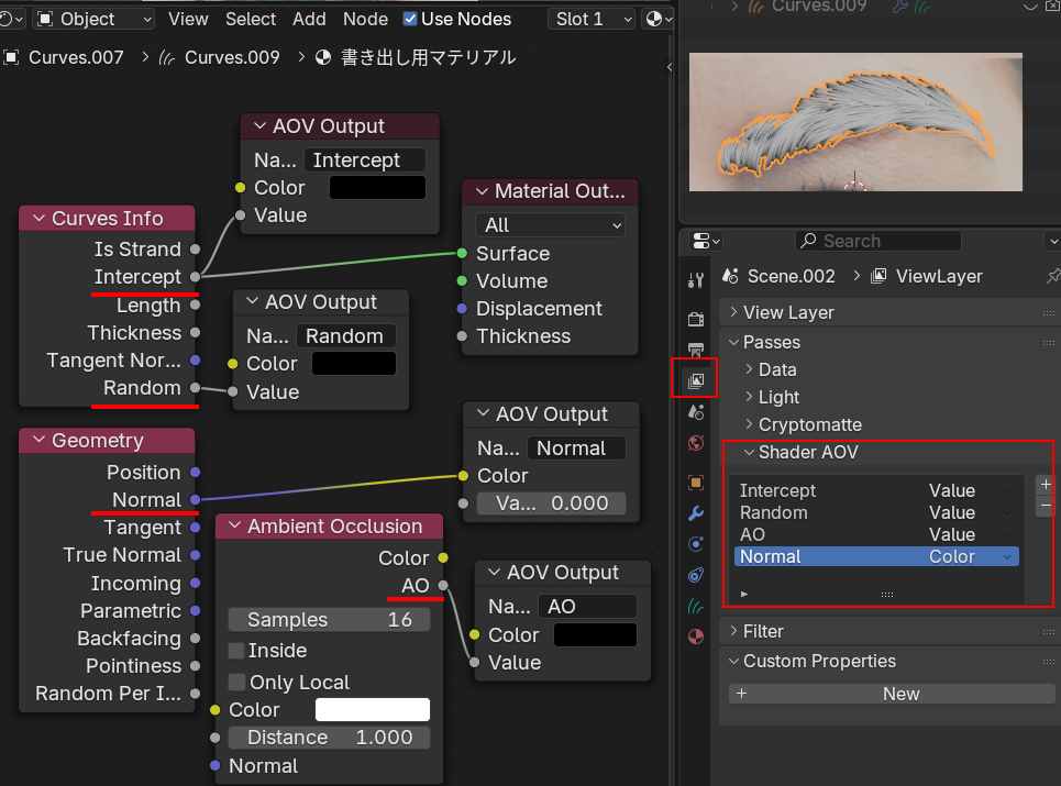 ヘアーカーブにコンポジットで出力するためのマテリアルを設定します。
