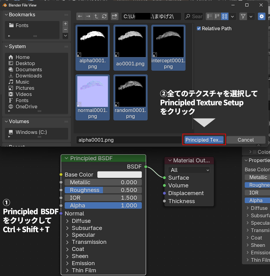 Principled Texture Setupをクリックすると、自動的にテクスチャをセットしてくれます。(全ファイルを選択しろって言ったけど、interceptとかrandomはBlenderは理解してくれないのでセットしてくれません。あとで自分で手動でImage Textureノードでセットしてください。)