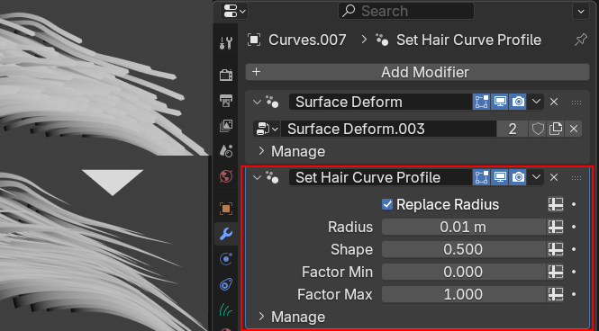 このままでは毛先が太いので、ヘアーカーブ用のジオメトリノードである