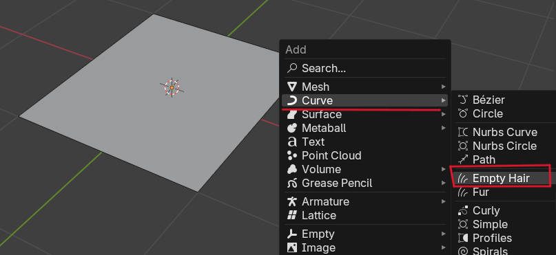 Curve > Empty Hair を選択してヘアーカーブを追加します。
