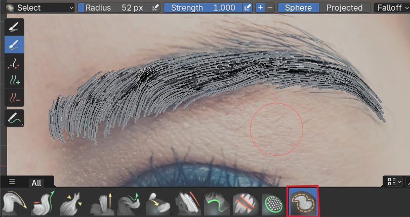 眉頭の部分の毛の長さが半分くらいになるようにGrow/Shrinkブラシで短く調整します。