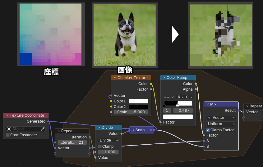 右図では元の生成座標を局所的にSnapしていくことで変則的なモザイク画像を作っています。