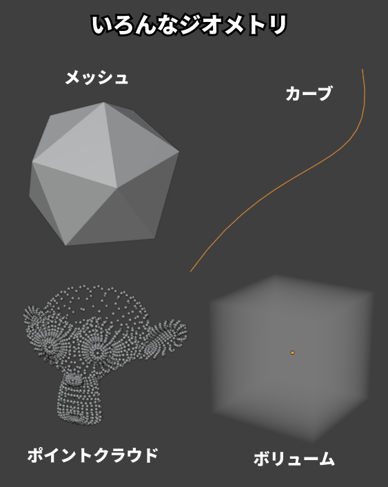 - ボリューム(Volume)…空間内に分布する値を持つ立体的なジオメトリ。密度や色などの属性を持ち、煙や雲、流体のような体積表現に使われます。
