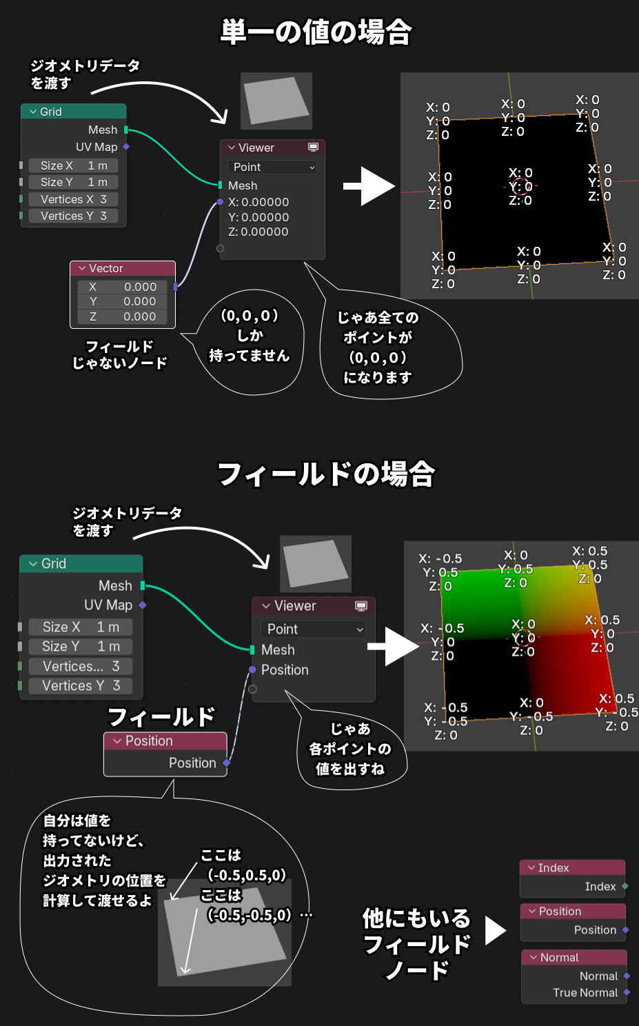 ビューア(Viewer)ノードに値を渡したときの、フィールドとフィールドではない値の違いを右図で表しています。