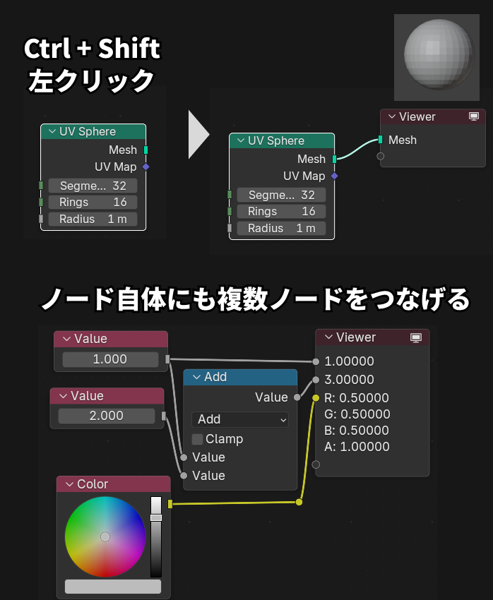 最初はどのノードをどこにつなげばうまく機能するのかわからないことも多いですが、基本はノードのソケットの形・色を見て判断すると良いと思います。色はデータの種類を表しているので、色が合っていればある程度正しく動きます。最初は「色を合わせる」と覚えておけば問題ありません。
