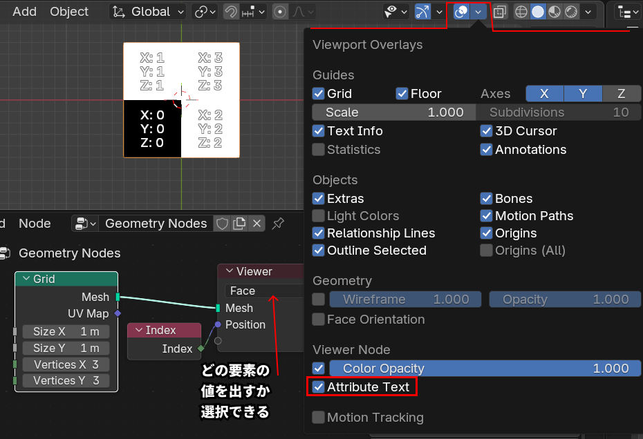 まず上部のビューポートオーバーレイのメニューを開き、Attribute Textにチェックを入れます。