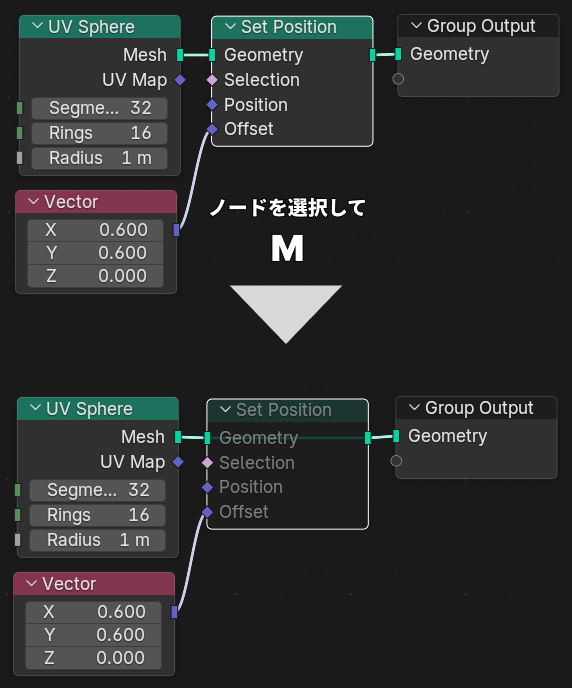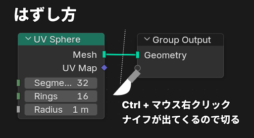 または、カーソルでノードのラインを直接外したりつなげたりもできます。ソケットからノードの線が出てきます。