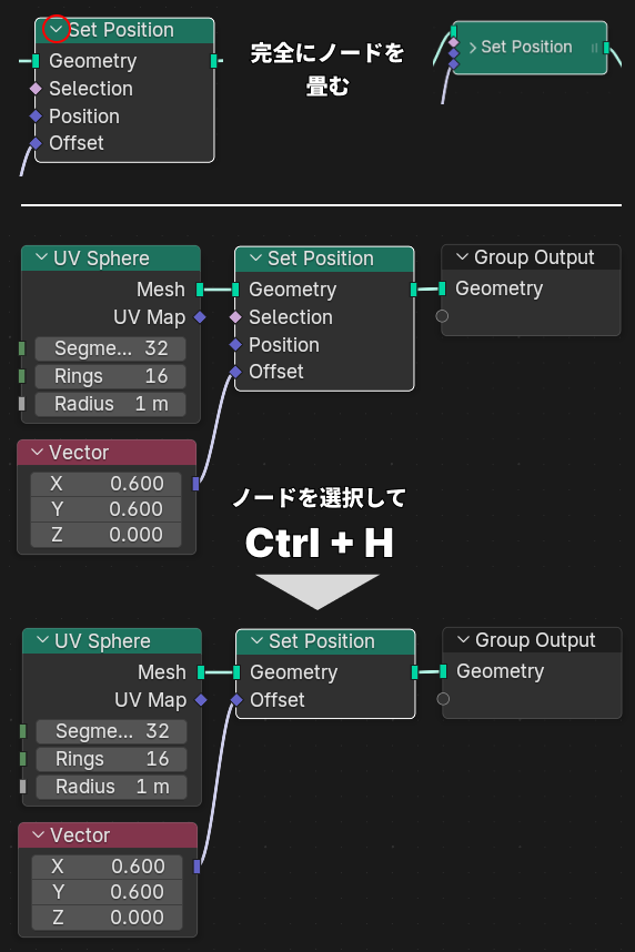 これでもノードを整理することはできますが、どこのソケットにノードをつないでいたか、わかりにくくなるので、使っているソケットは表示したいことも多いです。