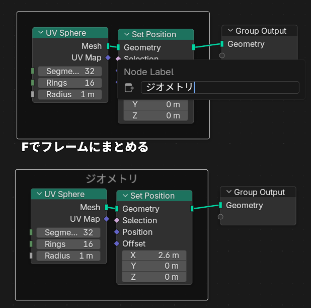 ノードをフレームに追加したいときはそのままノードを中に入れる。出すときはノードを選択してAlt+Pを押します。