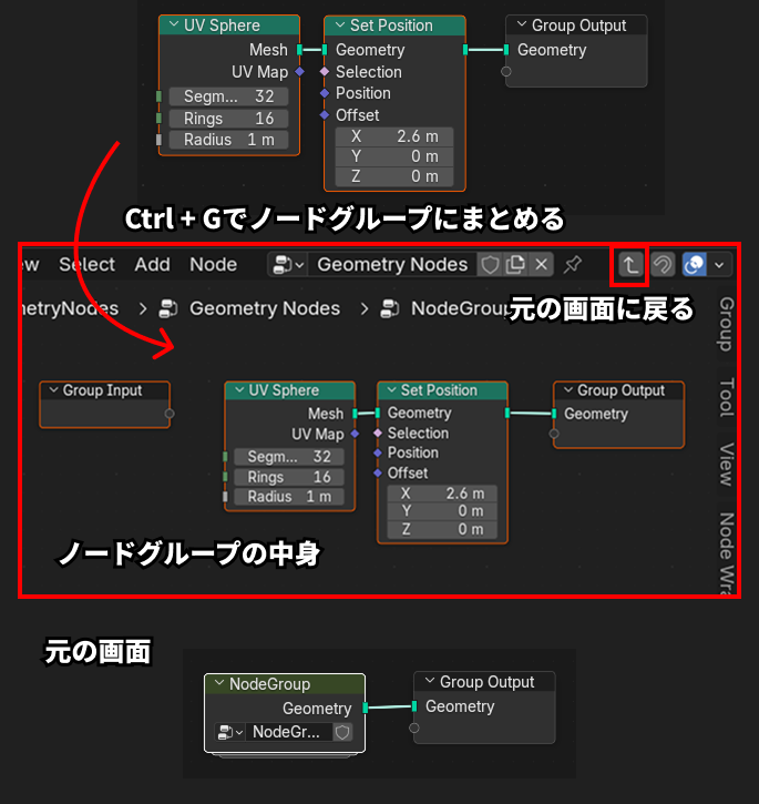 最初にノードをグループ化すると、ノードグループの中身の画面に移動します。ノードエディタ右上の矢印アイコンをクリックするか、Tabキーで元の画面に戻れます。