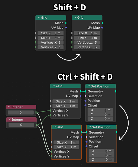 コピーしたいノードを選択してCtrl + Shift + Dでソケット入力が外れることなく複製できます。