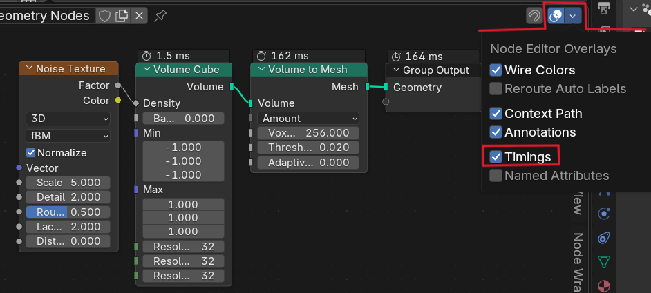 ノードエディタのオーバーレイメニューの中にTimingsという項目があります。チェックを入れると