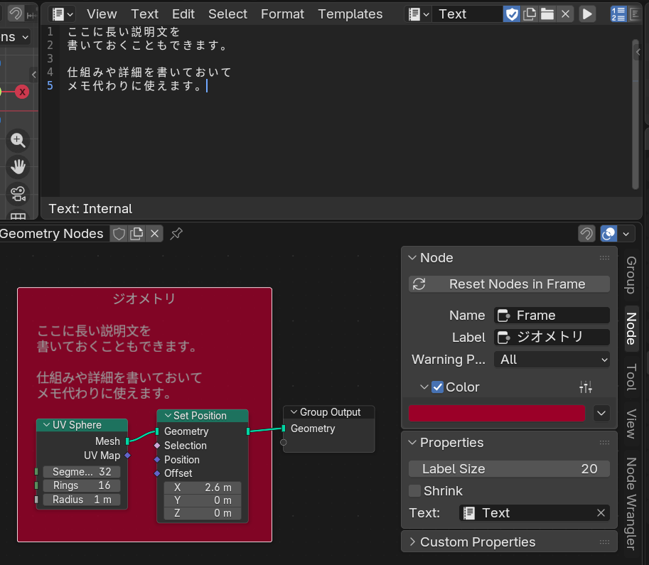 フレームを選択して、ノードエディタの右側にあるNodeタブを開くと、詳細なオプションを設定できます。
