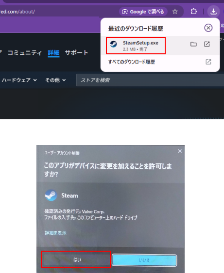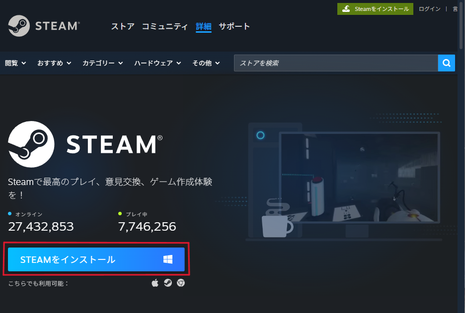 Steamをインストールボタンでインストールファイルをダウンロードできます。