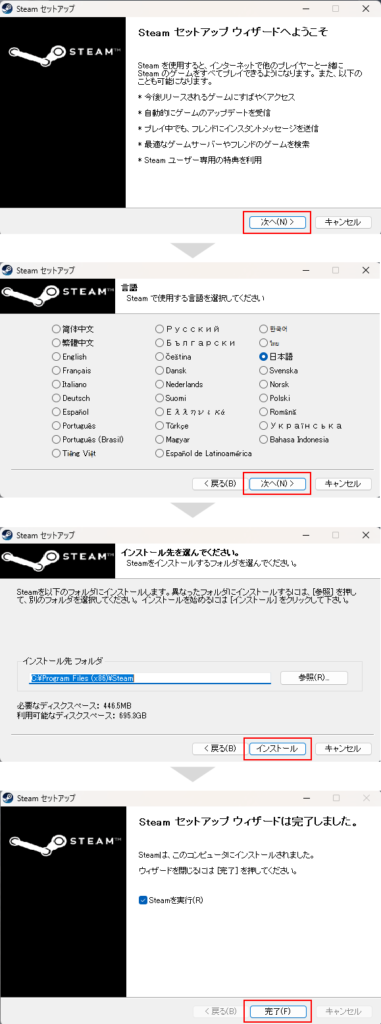 - Steamのセットアップウィザードが始まりますので次へをクリック
