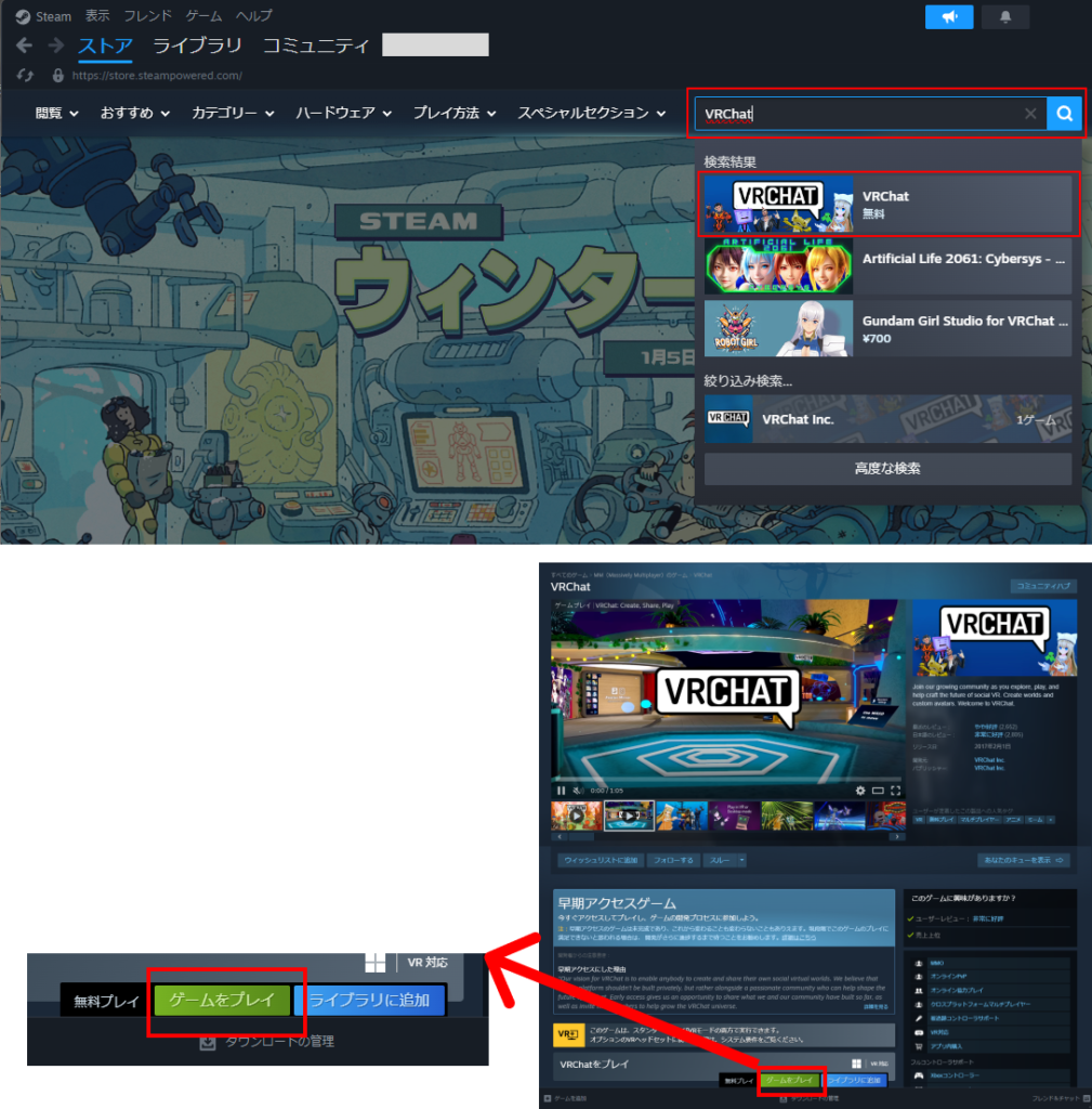 SteamへログインしたらさっそくVRChatを遊べるようにしましょう。