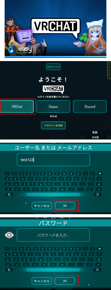ユーザー名、パスワードを聞かれるので、VRChatアカウント作成のときに決めたユーザー名(or メールアドレス)やパスワードを入力してOKをクリックして進めます。(※セキュリティのために表示名を変えた方は、最初に入力した変更前の名前を入れてください。忘れたって方はメールアドレスでもいいです)