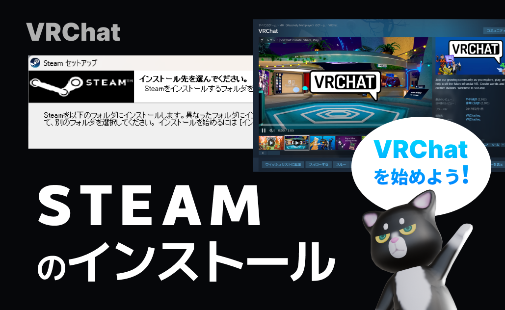 VRChatで遊ぶためにVRChatアカウントを作り、Steamをインストールする方法を解説しています。