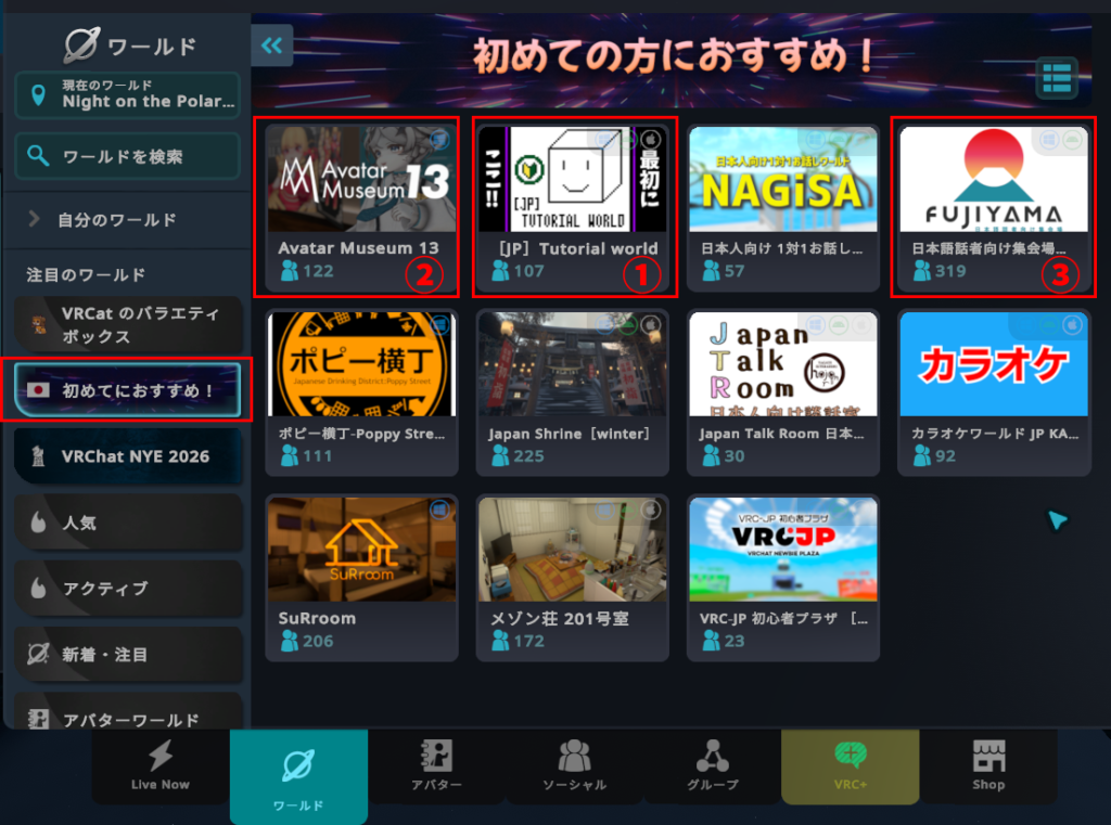 自分は、とりあえず [JP]Tutorial Worldにいくことをオススメします。一番最初に。操作方法とか、気を付けることをずらーっと見て回ることができます。 - Avatar Museum