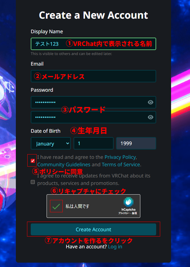 以下のVRChatサイトのアカウント作成ページへ移動し、VRChatのアカウントを作ってください。