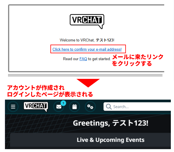 Create Accountを押すと、登録したメールアドレスにVRChatからリンクがついたメールが届いています。