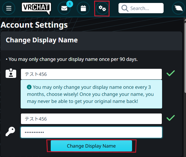 VRChatのゲーム内で表示される名前であり、アカウントIDにもなります。つまり、最初はアカウントIDと表示名が同一なので、ログインするときの情報の1つが丸見えになっているわけです。ゲーム内で表示される名前はあとから変更できますので、最初は仮の名前や、アカウントIDとして設定しておくとセキュリティ的には安全です。変更の仕方は下のセクションに書いています。- 表示名は3か月に一度変更することができます。
