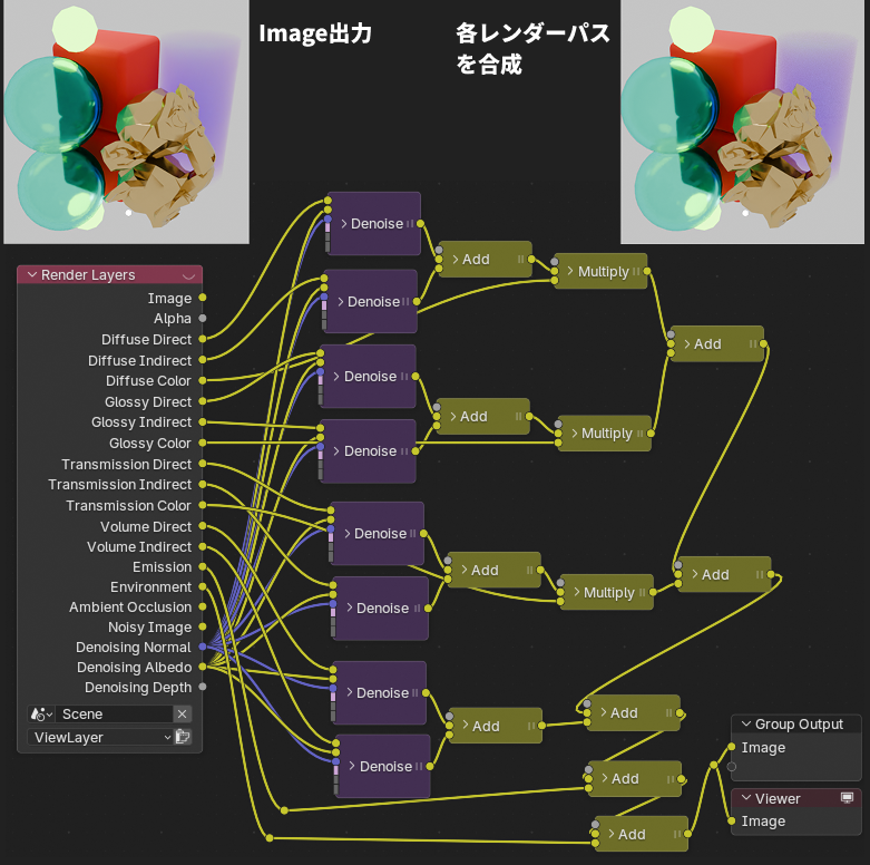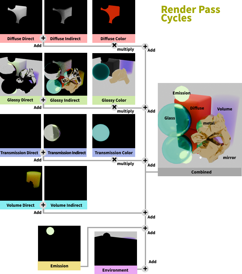 Cyclesではこれらのレンダーパス出力をMixノードで加算したり乗算したりして最終的な統合された画像を再構築することができます。