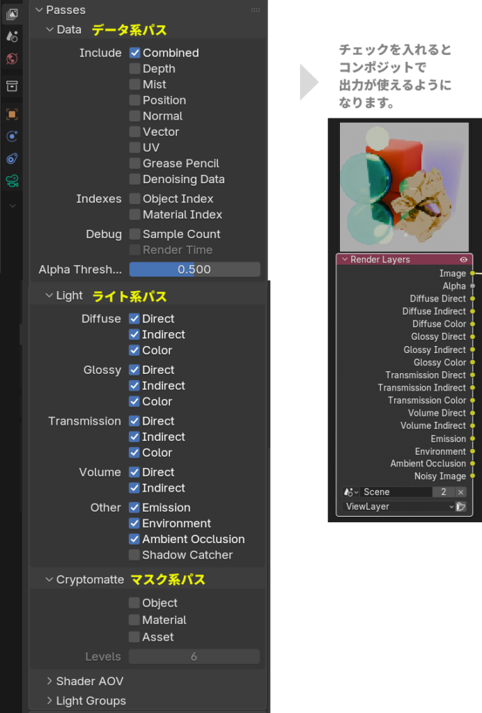 ここでチェックを入れたパスが、レンダリング時に出力され、コンポジットで使えるようになります。