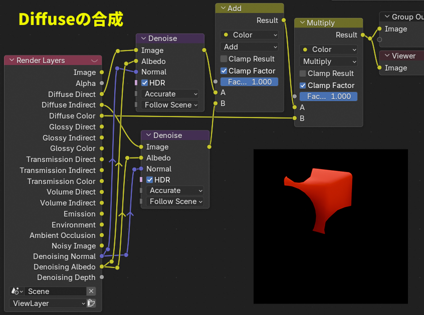 - まずDiffuse Direct/IndirectをDenoiseノードでノイズ除去します。(理由は後述しています)