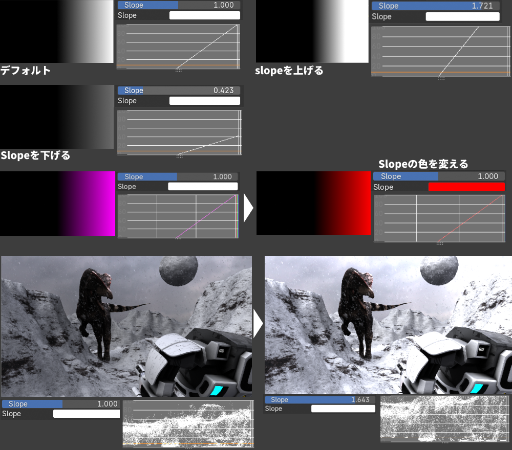 色を入れると、その色チャンネル成分に乗算されます。赤紫(1, 0, 1)の画像を、Slopeに赤(1, 0, 0)を入れると、1を掛けるRチャンネルだけが残るので、赤(1, 0, 0)になります。