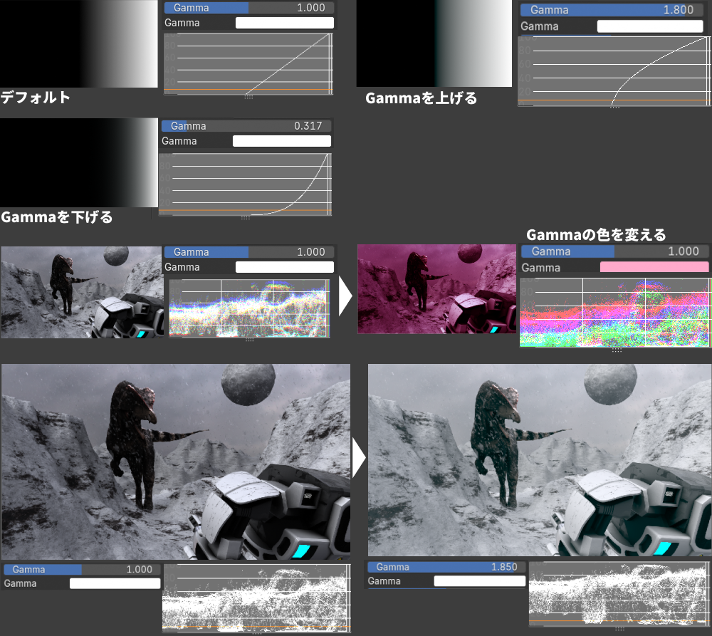 - コントラストをあまり強くしたくないけど形はそれなりに見えるようにしたい…くらいの気持ちでGammaを調節します。(Gamma はコントラストを作るというより、「暗部と明部のつながり方」を調整します。)