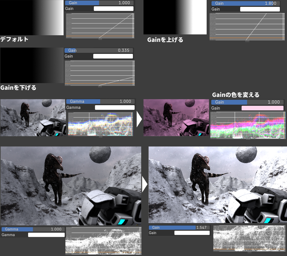 - Gainを上げて少し白を飛ばし気味にします。(ハイライト部分を持ち上げる)