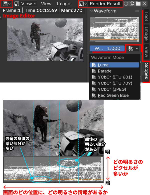 Waveform は、画像の明るさや色の分布をグラフで確認できる表示です。