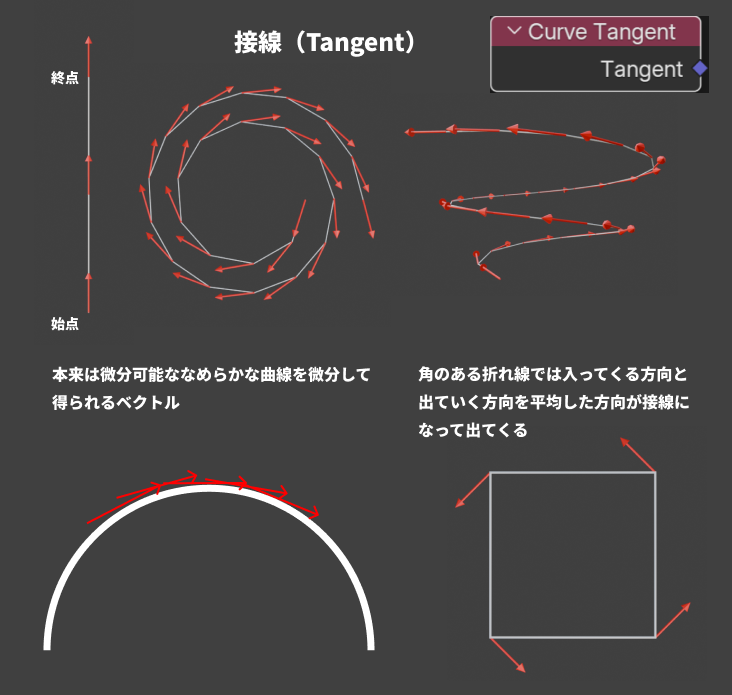 接線(Tangent)とは、カーブが進んでいる方向を表すベクトルです。