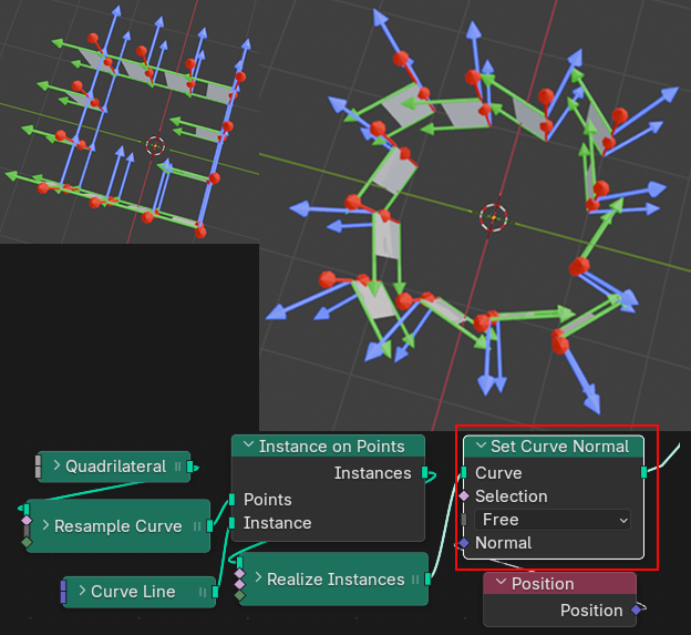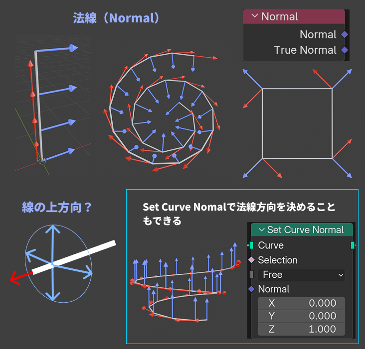 ジオメトリノード内のカーブの法線の決め方