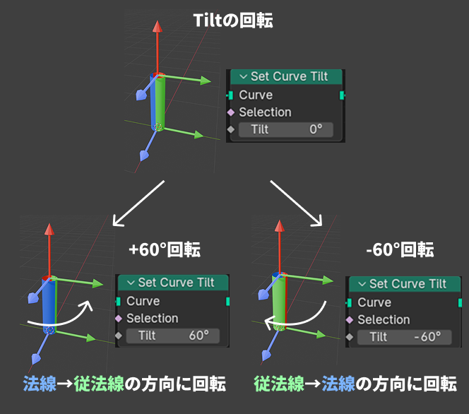 Tilt は、接線(Tangent)を回転軸として、法線と従法線の平面を回転させる角度です。
