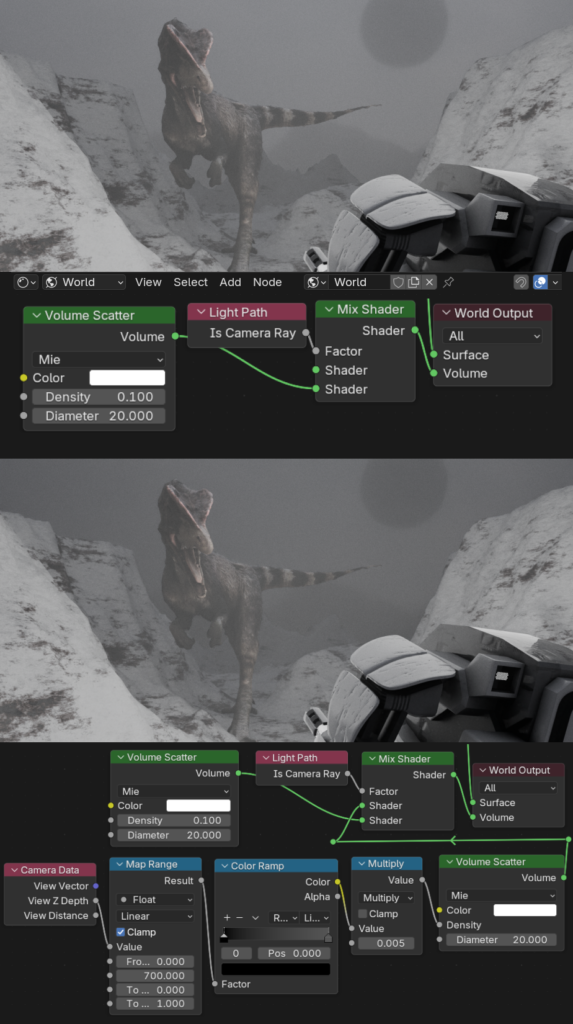 Mix ShaderノードでIs Camera Rayではない入力ソケットにもう一つVolume Scatterノードをつなぎます。