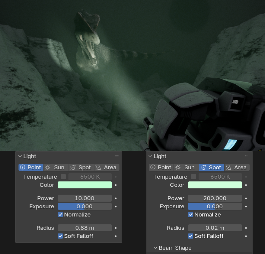 - Radiusをかなり小さくしないと拡散してライトの筋が見えなくなる