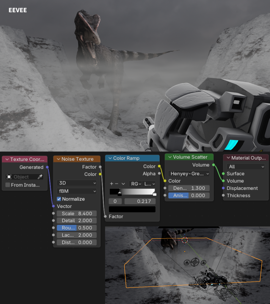 ボックスの形にフォグの塊ができてしまって不自然なので、Noise TextureやColor Rampで密度を変化させて、自然なフォグの形になるように調整します。