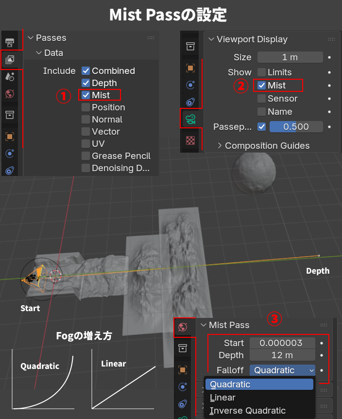 - Mist Pass > Falloff(ミストの密度の増え方)
