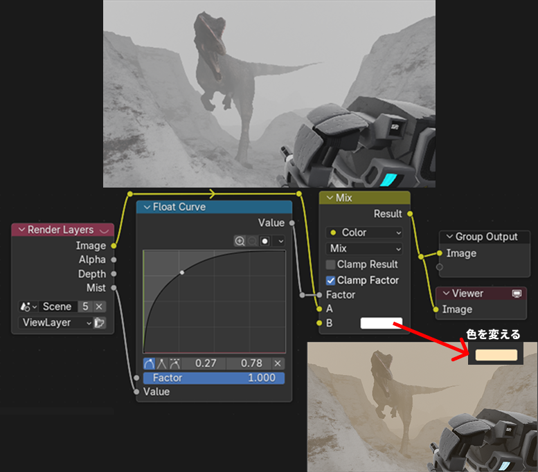 Mistの出力を使ってフォグを作る方法はたくさんありますが、基本的にはMixノードを使います。
